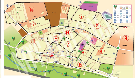 In this study, the mentioned vulnerability level estimation procedures could be utilized for any city in general. In order to better evaluate the seismic vulnerability of Zanjan’s buildings, some of the buildings throughout the city were randomly chosen. To be consistent through the sampling, the city of Zanjan was divided into 13 regions in which each region has relatively the same economic, social, and cultural characteristics as well as relatively the same construction year. Figure 2 represents the city divided into 13 regions. Table 1 summarizes the characteristics of each region, i.e. the number of the chosen buildings, the general characteristic, and the general types of the buildings, and a rough estimate of the construction year. Randomly selected buildings in each region were evaluated regarding both the level of seismic vulnerability as well as the type of the defects. In the following section, an example of a safe building and an example of a vulnerable building are represented.