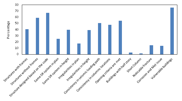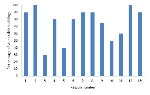 The percentage of vulnerable buildings over the total buildings in a specified region is represented in Figure 6. Based on the field observation and the gathered information from the curves the older regions show more vulnerability. This is due to the reason that the major material used for these building is masonry. The regions 2 and 12 with 100% vulnerability are appropriate examples of regions with mostly masonry structure having significant vulnerability issues. It is noted that, in some recently-built regions such as region 1, the frame systems are used but the structure have still noticeable vulnerable issues due to the irregularities in height or plan. The least vulnerable structures are those ones having frame systems as well as no irregularities in plan or height such as region 3.