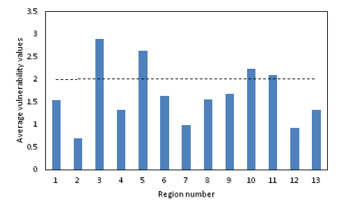 According to above-mentioned procedure, the rest of the buildings are investigated and associated information collected. The summary of the extracted data is indicated in Table 2. The average vulnerability factor for all the regions are indicated in the last column of Table 3. Accordingly, for the regions 3 and 5, the vulnerability factor is above the average, while for the regions 2, 7 and 12 this factor is less than the average values. The statistical investigation is done to investigate the regions with least and most building issues.