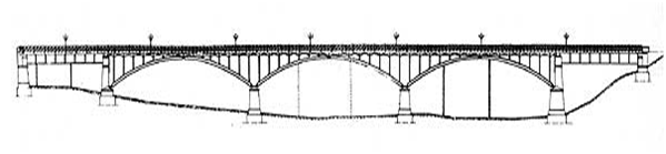 In Brazil, a first example of steel construction is the “Santa Efigênia” Viaduct, built in the early 1910s. The work was made of rolled steel, where vertical mullions rest directly on the arches and are equidistant of 3,665m, constituting 15panels, with a stringer interconnecting the tops of the mullions in the longitudinal direction; and with transverse frameworks, interconnecting the four parallel arches, plus vertical and horizontal braces.1 Figure 1 shows the longitudinal profile of this viaduct that had its structure brought from Belgium, ready to be assembled in 1913, undergoing renovations in 1950 (due to the special corrosion of the transvesine, spars and auxiliary bars).