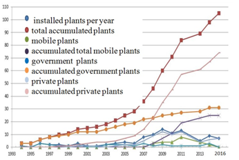 Figure 1 shows the implantation evolution of the recycling plants in the country, considering mobile plants (truck type) and fixed plants (private and government) and their accumulated totals.