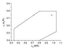 All dimensions of the geometry should be converted into dimensionless parameters with respect to the specimen radius, R, and diameter, D. The suggested standard specimen dimensions are given in the ISRM suggested methods.7 Other selections of specimen geometrical dimensions are possible, but in order to have a valid test, the two most important selected dimensions; dimensionless final notched crack length (α1) and the dimensionless quantity, αB, must fall within the range outlined in Figure 2. The length of initial crack (α0), final notched crack (α1) and αB (B/R) are the three geometric parameters for the CCNBD specimens.7 All specimen geometries used in this research were in the valid ranges indicated by the red circle in Figure 2; the full validity range is also shown. For fracture toughness testing, the important stress intensity factor value for the specimen is the minimum stress intensity factor, denoted as , as it corresponds to the failure load (Pmax) recorded during testing. The fracture toughness value of a CCNBD specimen is calculated as follows: