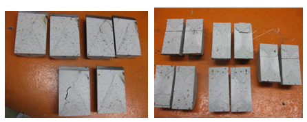 In general, a load to achieve opening mode crack propagation can be applied to the specimen by direct tension, compression or bending. These two SR and CCNBD methods could be classified in terms of their loading conditions. The SR method is one of the methods suggested by ISRM10in which a tensile load is directly applied perpendicular to the initial notch plane. In contrast, a CCNBD specimen is loaded in compression along the diametric plane. Hence, a comparison of these two methods has attracted attention in recent researches. Failure load and fracture toughness values of the tuff specimens determined with the CCNBD method were compared to the results of SR tests. The maximum failure loads for CCNBD specimens were found higher than those for SR specimens in general. Figure 6 shows the SR and CCNBD specimens after testing. The maximum recorded load and the calculated fracture toughness values obtained from both ISRM standard tests are shown in Table 1 mode I fracture toughness values of tuff specimens obtained for the CCNBD specimens are lower than those obtained by the SR method although bigger failure loads were obtained with CCNBD tests than with SR tests.