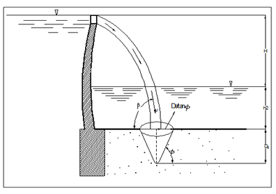 It should be noted that the proposed approach can make use of past methods by utilizing the Erodibility Index method by Anandale1 and Comprehensive Scour Model by Bollaert2 for checking the threshold of erosion and obtaining relevant falling jet parameters from computational hydrodynamic simulations. In other words, integration between the proposed approach herein and some existing methods seems very possible and quite useful. Though not addressed clearly in past research, the scour hole average side slope angle, ϕ, should depend primarily on the jet impingement angle β in addition to other important factors such as the bed material composition, jet velocity and falling head. For naturally formed scour holes, the scour hole average side slope angle, ϕ, was assumed 30○ for eight cases for which the angle for jet impingement was in the range (24○ to 51○). For the severe case of Kariba Dam where the jet impingement angle was as high as 60○, a value of 60○ was assumed. Further research is needed in this area to find the exact functional relationship for ϕ. The present approach is quite useful in providing the necessary information for designing of pre‒excavated scour holes. The predicted scour depth from the present approach assuming non‒existence of the pre‒excavated scour hole is the key to this step. It is noted that for well designed ‒excavated scour holes the jet velocity structures should diminish (i.e. close to zero or very minimal) at the pool bottom and hence no more scour should occur. As velocity is a key component in influencing formation of the scour hole, a near zero velocity would predict no further scour and ensure stability of the scour hole. The velocity structure inside the plunge pool and near the pool bottom is best obtained from CFD models. If a relationship exists between the length of the scour hole and its width at plunge pools, then it would be possible to use an elliptical conical shape for the scour‒hole model which would be more general. This is also another area for further research. The velocity used in the present approach and all other existing methods is the mean flow velocity, i.e. neglecting explicitly the effect of the turbulent velocity fluctuations. The discharge Q can be written as Q = Aj V, where Aj is the cross sectional area of the flow jet. Eq. (4) for the work done by the attacking flow jet can then be written as: