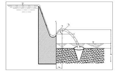 Capuozzo et al.,33 reported data for the case of Chucas Dam, Costa Rica. The Chucás hydroelectric project, owned by ENEL Costa Rica, is located about 40 km west of San José, the capital. The project, dams the Tárcoles River by a 63 m height dam, then the water is transported about 400 m downstream by a 6.5 m penstock, up to a powerhouse where 2 Francis type units generate a total output of 50 MW. For flood control, the dam is equipped with four radial gates, with dimensions 15 m × 12.4 m, capable of discharging 5400 m3/s under design conditions and up to 8100 m3 /s, as a verification flood. These large discharges are handled through a ski‒jump spillway chute discharging on the rock bed downstream of the dam. A critical consideration in this kind of spillway was the plunge pool, which ineffably will form because rock scour under the free falling jet. A pre‒excavated plunge pool with depth of 20.0 m was seen necessary by Capuozzo et al.,33 to avoid future uncontrolled scouring.