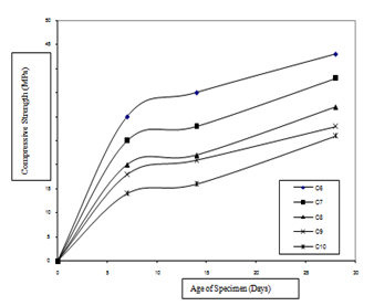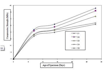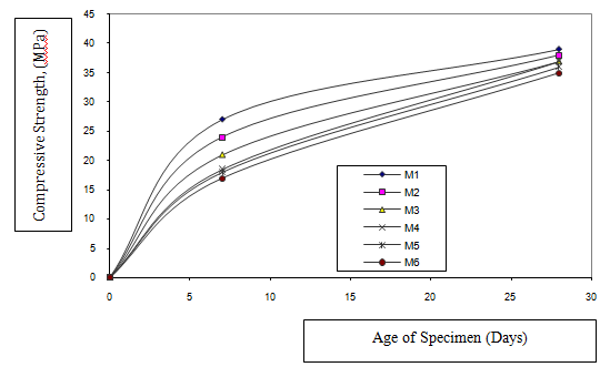 The results of the investigation are plotted in Figures 1-6. Figure 1 shows the development of compressive strength of mortar with age. It has been observed from this figure that the mortar specimens of Mix M1 show highest strength value at all ages.