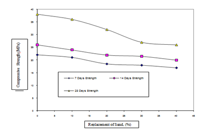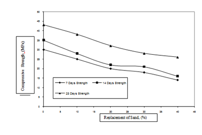 Effect of replacement level of sludge on compressive strength of concrete (M20 Grade) is shown in Figure 5. It is observed from this figure that maximum drop in compressive strength is observed at 40% replacement level of sludge. For this replacement level the drop in the 7days compressive strength as compared to the reference mix specimens is 22.7%. The drop in the corresponding 14 and 28 days compressive strength is 23.1% and 31.5%, respectively.