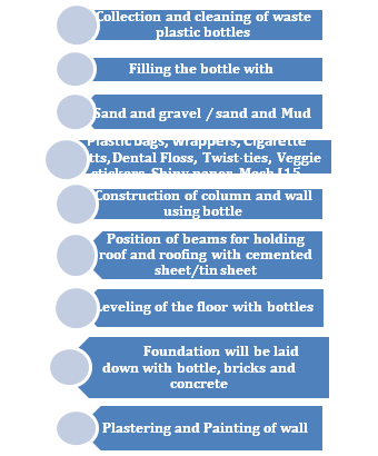 Shilpi et al.,2 concluded that by utilizing PET bottles in construction recycled materials, thermal comfort can be achieved in very low cost housing, benefit in residents for those who cannot afford to buy and operate heating and cooling systems. Plastic is non-biodegradable, toxic, highly resistant to heat and electricity (best insulator) and not recyclable in true sense, plastic PET bottles use in bottle brick technique. This gives relief for the poor people of India to provide cheap and best houses for living.3-5