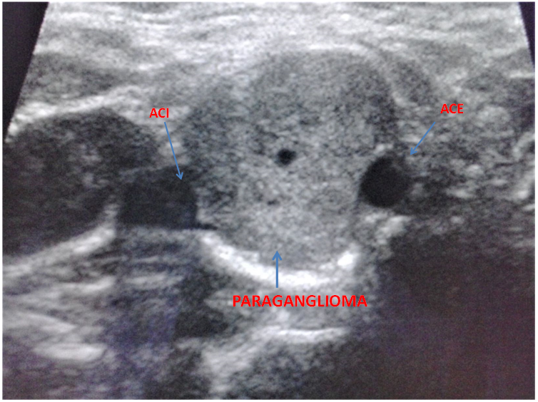 Figure 1 Ultrasound of the neck- tansversal plane. Arrows are marking internal carotid artery, external carotid artery and paraganglioma.