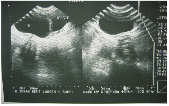 Hydatidosis is a pathognomonic but exceptional sign, reflecting the opening of the cyst in the bladder.9 The physical examination discovers a hypogastric mass that remains unchanged after bladder emptying. The digital rectal perceives the inferior pole renit of mass.10 The diagnosis of hydatid cyst of the bladder can be easily evoked in front of the signs of orientation: On the clinical level, the interrogation researches the notion of contact with the dogs, the notion of previous intervention on a hepatic hydatidosis, the existence of an acute accident evoking rupture or fissuring and hydaturia.9 In their absence, this diagnosis can be difficult at the clinical stage.