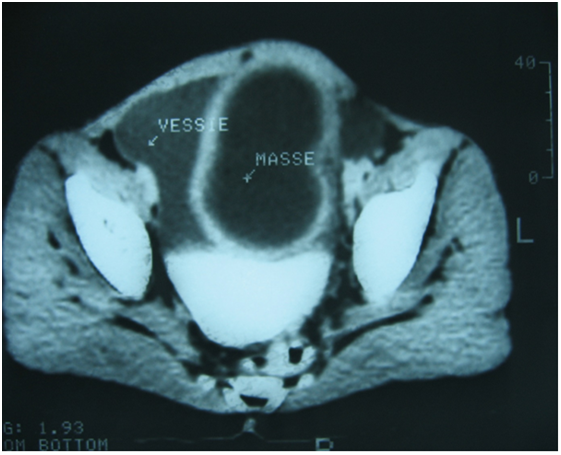 The abdominal ultrasound requested in first intention had mounted a cystic mass, pushing laterally the bladder and could correspond either to a diverticulum of the bladder, or to a cyst of the ovary (Figure 1). CT scan was also performed and had objectified a cystic mass under the umbilical, median compressing behind the bladder dome with overflow to the right of the bladder horn, evoking a cyst of the urachus or an ovarian cyst (Figure 2). Surgical exploration revealed a cystic mass forming part of the bladder dome, evoking a cystic tumor of the urachus. The mass was removed by removing the implantation base from the bladder dome. The postoperative consequences were simple. The pathological report concluded that there was a hydatid cyst of the bladder dome.