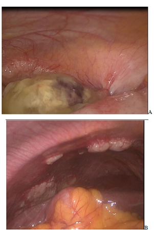 A 69years old woman is visited for diffuse abdominal pain, weight loss and anorexia associated with epigastralgia and difficult alvus. In remote anamnesis she has had a complete isteroannessiectomy for cancer 20years ago allow by CHT plus RT. She had only arterial hypertension and mild obesity as comorbidities. At objective exam her abdomen was normal with no mass in rectum at digital exploration. Gastroscopy and colonoscopy were negative and ematochimic exams were normal with tumoral markers as Ca 15.3 40ng/ml, Ca 19.9 108ng/ml, Ca 125 23ng/ml. She was submitted at CT SCAN which demonstrated mild ascites and some nodules in the Glissonian capsula in VI-VIIVIII segment, in right parieto-colic and pararectal region and in omentum (Figure 1). For this reason she was subjected to exploratory laparoscopy which demonstrated diffuse mucinous carcinosis in the same region as CT scan with implication of the appendix (Figure 2). Peritoneal biopsy and histological finding revealed diagnosis of Pseudomyxoma Peritonei. Then she was studied and prepared for laparotomy with pneumological and cardiologic visit plus echocardiography which revealed only arterial calcification and after a new toraco-abdominal CT scan for staging that demonstrated two specific pulmonary nodules in right superior lobe and left lateral lobe respectively 6mm and 7mm with no pleural effusion. Peritoneal carcinosis in right iliac fossa, in left flank, in the mesenteric region, in small bowel and in the rectum with peritoneal effusion in the Douglas. PET demonstrated only contrast enhancement in the umbilical region in the previus region laparoscopy.