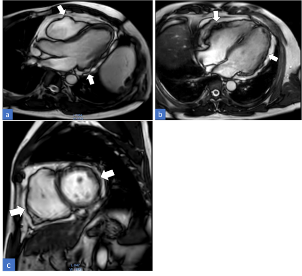 A 39 years old male patient presented to our emergency department with complaints of palpitations, frequent syncopal episodes, constant feeling of exhaustion, and diaphoresis. A baseline investigation was done including an electrocardiogram (ECG) and echocardiogram (ECHO). Based on the test results, the patient was suspected to have an ARVC and was referred for CMR imaging to confirm the diagnosis.
