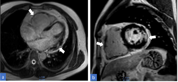 ARVC is an inherited form of cardiomyopathy mostly seen in young adults that frequently goes undiagnosed as its clinical signs and symptoms vary from being completely symptomless to fatal arrhythmia and sudden mortality.2 Hence, to make the interpretation easier, the diagnostic criteria namely “The task force criteria” were first introduced in 1994. It has been followed thereafter with a major update in 2010. The significant CMR imaging findings included in the criteria are Regional RV akinesia or dyskinesia or dyssynchronous RV contraction plus one of the following: RV end-diastolic volume indexes ≥ 110 mL/m2 (male) or ≥ 100 mL/m2 (female) Or RV ejection fraction ≤ 40% (1, 2, 3). Our present case here met all of the mentioned CMR imaging criteria, thus giving a confirmed diagnosis of ARVC. As the name implies, ARVC primarily affects the right ventricle, however, it can also affect the left ventricle.4,5 This is when CMR is again considered a crucial modality to assess the left ventricular involvement as it may not be evident on an echocardiogram. In our case as well CMR revealed the involvement of the left ventricle giving an impression of an “Arrhythmogenic Biventricular Cardiomyopathy” rather.