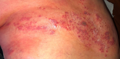A 55-year-old woman was referred to the surgical emergency department with severe acute abdominal pain located in the right upper quadrant for 18 hours. The pain was not responsive to analgesics as paracetamol or non-steroidal anti-inflammatory drugs (NSAIDs) and had lasted for about 8 hours. The pain was accompanied by anorexia. There was no pyrexia, vomiting, or changes in bowel habits. The patient was diagnosed with herpes- zoster two weeks before and treated with oral acyclovir. There were no past medical, or surgical history. On physical examination: Temperature, pulse, and blood pressure were within normal limits. A unilateral vesicular eruption was found in the upper right abdomen spreading to the back (Figure 1). Murphy's sign was positive. Lab results were as in (Table 1). Abdominal ultrasound showed a gallstone that lodged in the neck of the gallbladder and it was about 1cm. She underwent a laparoscopic cholecystectomy. Grossly; The gallbladder size was about 5x9cm, wall thickening 3mm, it contained sludge and had strawberry gallbladder appearance. One crystal shape stone of about 1.2cm was found inside the gallbladder (Figure 2). Microscopic findings showed no malignancy and suggested the diagnosis of chronic cholecystitis. The stone had an unusual shape, we couldn't examine it as the test is not available in our hospital. The patient was discharged on the same day of surgery with no complications. We followed the patient for one year after the surgery, she is healthy now with no abdominal pain or post-herpetic neuralgia.