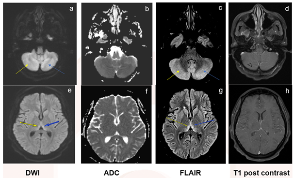 Figure 1 Shows hyperintensity in the bilateral cerebellum and thalami concerning for edema (a-c, e-g, ) and cerebellar folia enhancement (g, )..