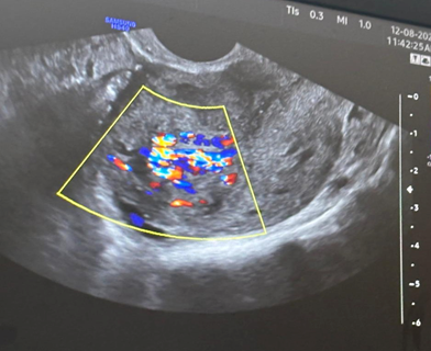 A urine pregnancy test turned out to be negative. On sonographic evaluation, the uterus was 5.4cmX5.1cmX7.3cm (mildly bulky) with heterogeneous echotexture with echogenic areas measuring 2.1cm X 1.87cm X cm2.1 cm with few anechoic areas within and increased vascularity (PSV: 64 cm/sec) within the myometrium which extended into the endometrial cavity. Multiple dilated veins were seen in bilateral adnexa. This led to a differential of uterus arteriovenous malformation (AVM) versus grade 3 retained products of conceptus (RPOC). Considering the high PSV and the type of vascular flow within the myometrium, the diagnosis was more inclined towards AVM (Figure 1).