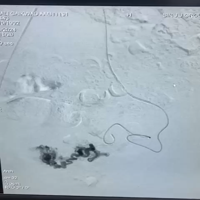 To be double sure, we tested her beta HCG level which was 36.7 mIU/ml. We performed a pelvic angiogram for better visualization. It showed hypertrophied bilateral uterine arteries and intrauterine spiral arteries with prominent uterine blush, bilateral external iliac arteries and infrarenal abdominal aortogram was normal. In view of these findings, uterine artery embolization was decided upon.