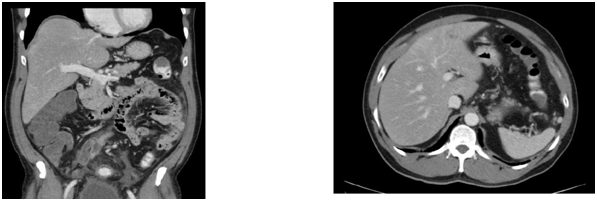 In view of the elevated Troponin I, the patient was initially treated as for Non-ST elevated myocardial infarction (NSTEMI). He was immediately started upon dual anti-platelet therapy together with low molecular weight heparin and subsequently underwent an emergent coronary angiogram which showed minor coronary artery disease. Computed Tomography of Pulmonary Arteries was also performed which showed no evidence of pulmonary embolism (Figure 2). The anti-platelet and low molecular weight heparin was then stopped. However, his gastro-intestinal symptoms worsened and he started to spike a temperature once more in the ward. He complained of persistent abdominal pain despite bowel clearance with laxatives. Computed Tomography of Abdomen and Pelvis was performed. The result showed long segment rectal wall thickening seen with peri-rectal fat stranding which was initially thought to be related to aggressive laxative consumption , but malignancy and infection should be ruled out with suggestion of endoscopy; extensive omental fat stranding, most prominent in the upper abdomen abutting the anterior wall of the transverse colon where there was thickening of the anterior transverse colonic wall to rule out possibility of underlying malignancy; peritoneal fat stranding and nodularity seen with minimal ascites; small volume but rounded inferior mensenteric and para-aortic lymph nodes seen.