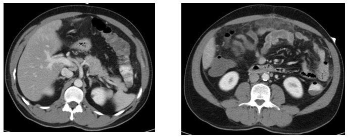 The CT thorax and CT pulmonary angiogram showed marked pulmonary infiltrates and thrombi. There was a thombus in the segmental right lower lobar pulmonary area, with an infracted region in the right lung base. There was also another thrombus in the anterior segmental branch of the left lower lobe pulmonary artery. Subsequently, the patient suffered from opthalmoplegia due to stroke in the ward. The MRI/MRA revealed acute infarcts in the left cerebellum, occipital lobe and left medial longitudinal fasciculus. He also developed gut vasculitis and a perforated transverse colon (Figure 3) (Figure 4). The findings on CT abdomen and pelvis were consistent with that of a small/medium vessel vasculitis. Multifocal ischemic colitis was seen involving the right lateral and posterior walls of the rectum as well as the inferior wall of the mid transverse colon with suggestion of perforation on both sides. The superior rectal artery was thrombosed as well. The patient then underwent emergency laparotomy with resection of small bowel and stoma creation. Post-operatively recovered well and was discharged two weeks after. Currently he is on follow up with rheumatologist, neuroopthalmologist and general surgeon (Figure 5).