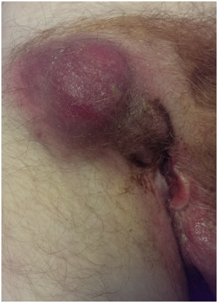 On examination the patient appeared well, with normal observations. There was a 5x5cm fun gating mass in the right inguinal region, which was warm, erythematous, and tender and fixed to the underlying tissues (Figure 1). There was also a 2x2cm deep ulcer on the lateral aspect of the right hemiscrotum which did not appear infected at the time. Examination of the rest of the patient was otherwise unremarkable except for an early diastolic murmur, which was not new.