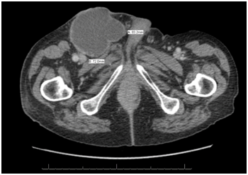 CT of the chest, abdomen and pelvis was then performed in order to determine the extent of the disease. Imaging revealed a large necrotic right inguinal lymph node (Figure 2). There was also evidence of involvement of the contralateral inguinal lymph nodes. Needle aspiration of the lymph node mass confirmed metastatic spread from the scrotal SCC.