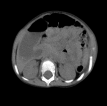 Abdominal ultrasound was normal with no hypertrophic in the pylorus. Barium enema was normal that exclude Hirschsprung disease. Abdominal X-ray showed expansion in the stomach with malposition of gases (Figure 1). Esophagogastroduodenoscopy (EGD) was performed that showed severe duodenal expansion at segment 2 followed by severe narrowing and inability to cross. An abdominal computed tomography scan (CT) showed the annular pancreas surrounding segment 2 of the duodenum (Figure 2). The patient did not have associated anomalies of the annular pancreas (Echocardiography, ECG, and abdominal ultrasound did not show any anomaly). The patient underwent surgery, an incomplete annular pancreas with duodenal stenosis in the second portion of the duodenum was observed. Duodenojejunostomy was performed (Figure 3a, 3b). The postoperative course was uncomplicated, and oral feeding was tolerated from the fourth day. The patient was discharged from the hospital on the 8th day after the operation. On follow-up, the patient was asymptomatic with normalweightgain.