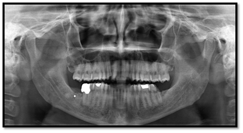 A 35-year-old male patient reported to college of Dentistry, Jazan. In routine examination of the other teeth on OPG (Orthopantamogram), it was found that a sharply defined radiopaque mass in the right mandibular third molar area (Figure 1). On history, patient had undergone surgical extraction of the third molar at a private clinic one year back. There was no history of pain, swelling, discharge or paresthesia in that region. Based on history, clinical and radiological correlation, the object was assumed to be a broken fragment of bur. The broken bur fragment was buried in the region approximately 5 to 7mm from the upper border of alveolus and 7 to 8mm away from the distal root of right mandibular second molar. As patient was not having any of the signs and symptoms related to that broken bur fragment, no treatment was done and patient was kept on constant observation.