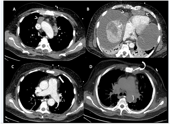 A sixty five-year-old male, diagnosed as a case of non-alcoholic steato-hepatitis related compensated chronic liver disease since one year, presented to us with complaints of progressive non cholestatic jaundice without prodrome for a period of 20 days. This was followed by painless abdominal distension and decreased urine output. The patient subsequently developed altered sensorium in a period of two days associated with excessive drowsiness along with high grade fever. He was teetotaller with history of type II diabetes since 12 years and had no other co-morbidities .There was no history of blood transfusions, alternative medicine intake. He was intubated outside and shifted to us on ventilator and inotropic support. Labs results showed haemoglobin 9.6 g/dL, white blood cell 27880/mm3 ,platelet 98000/mm3, BUN 93 mg/dL ,serum creatinine 4.01mg/dL ,severe metabolic acidosis with arterial lactate of 4.5 mmol/L. Liver function tests showed AST 40 U/L, ALT 32 U/L, alkaline phosphatase 129 U/L, GGT 45 U/L and bilirubin of 1.18 mg/dl. PT INR was 4.5 with very low fibrinogen. Acute viral markers (hepatitis A & E) and hepatitis B and C serology were negative, malaria antigen and leptospira IgM were nonreactive. Autoimmune markers were negative. Ultrasonography(USG) showed features of liver cirrhosis with portal hypertension. It also showed ill-marginated ill-defined subtle hypoechoic lesion in superior segment of right lobe with hypoechoic thrombus in right hepatic vein protruding into the inferior vena cava (Patients had been regularly following and his USG 3 months ago did not show any SOL). Ascitic fluid white cell count (842 cells/dL) with 72% neutrophils suggested spontaneous bacterial peritonitis. The α-fetoprotein level was 82 ng/mL. CA 19-9 and CEA were normal. Continuous renorenal replacement was initiated along with aggressive medical management for metabolic acidosis and hemodynamic instability. Contrast CT scan confirmed liver cirrhosis, gross ascites and splenomegaly (Figure 1) it also revealed a hypo-dense, ill-marginated, non-enhancing, sub-capsular mass in segment VII and VIII with non-enhancing, occlusive skip thrombi in the right hepatic vein protruding into IVC, occlusive thrombus of the right and main portal veins protruding into the left portal vein and retro-pancreatic splenic vein. Multiple enlarged necrotic pre-vascular, anterior peridiaphragmatic and pericardial lymph-nodes were also seen (Figure 2). In view of coagulopathy ,hemodynamic instability and cirrhosis it was decided to do the internal mammary lymph node after TEG based correction of coagulopathy . It showed (Figure 3) cells with biphasic neoplasm with epithelioid and spindle cells, marked nuclear pleomorphism with giant and bizarre nuclei and a high Ki-67 index. IHC showed strong coexpression of PanCK and Vimentin and was negative for LCA, CK7, CK20, TTF1, Hep Par-1, Glypican 3, p40. These features were suggestive metastatic PHSC. Meanwhile patient’s condition rapidly worsened over period of 5 days with development of multi organ failure. He eventually succumbed on the seventh day of hospital stay.
