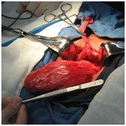 During hospitalization the emergency hypertensive crisis was solved during first 24hours with three antihypertensive drugs and hernioplasty was scheduled. We perform a transverse suprapubic incision and dissect the planes until spermatic cord was shown. This structure had a 3cm diameter. Dissection of the spermatic cord and reference of it was done digitally, the cremaster muscle was opened longitudinally and dissected out of the reference. An indirect inguinal sac and a giant paraperitoneal scrotum cystocele was found, without ischemic signs, a deep inguinal ring diameter >4cm with epigastric vessels displacement and weak inguinal floor. After dissection of the urinary bladder (Figure 2), it was reduced with the sac to abdominal cavity, a simple stitch of polypropylene 3-0 to close deep inguinal ring and a Lichtenstein hernioplasty with a 10x5cm mesh was scheduled. After three days renal function was normal with creatinine reduction to 0.8mg/dL and antihypertensive medication were diminished progressively until day 15 when was suspended and foley removed. At six months follow up he remains asymptomatic.