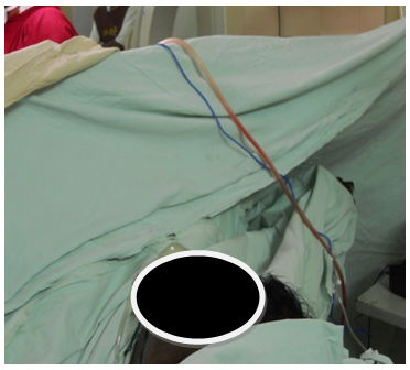 On questioning the patient, we realized that the suction catheter pipe draining from the surgical field had been placed over the partition screen in the patient’s direct line of sight. He was able to see the blood flowing through the suction tube and had become very anxious to see his blood draining out. This provocation had caused the psychological disturbance that had led to the tachycardia. Realizing this, we covered the suction drain with another sterile cloth and sedated the patient with intravenous Midazolam 0.1mg/kg. The tachycardia settled down dramatically with the heart rate decreasing to less than 90 per minute. The surgical course was unremarkable after that and the patient was very comfortable throughout (Figure 2).