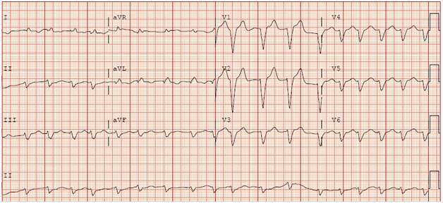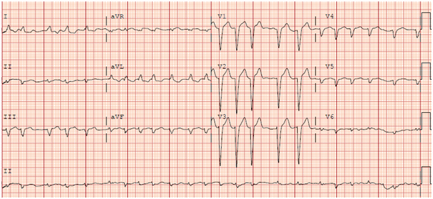 A 77-year-old Caucasian female with history of chronic atrial fibrillation (AF) on propafenone 150mg three times daily was admitted for uncontrolled ventricular rates and dyspnea on exertion. Physical exam was relevant for irregularly irregular heart rate at 145 beats per minute (bpm). Her initial electrocardiogram (ECG) revealed atrial fibrillation at a rate of 145 beats per minute (Figure 1). Labs and transthoracic echocardiogram (TTE) were in normal limits. Her propafenone was increased to 225mg three times daily which did not improve her AF. She was then successfully electrically cardioverted to normal sinus rhythm two days later and was discharged on this increased dose of propafenone.