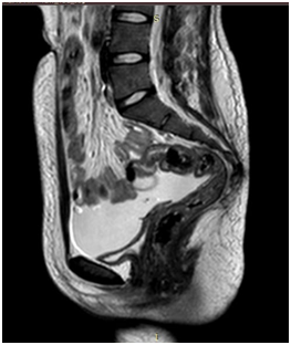 ECG showed signs of LVH. Echocardiography affirmed concentric left ventricular hypertrophy with moderate mitral regurgitation, aortic regurgitation and mild tricuspid regurgitation with pulmonary hypertension.MRI abdomen and pelvis was done and revealed absent uterus blind ended vaginal pouch 3cm.Ovaries could be visualized showing mature follicular activity with normal urinary bladder, urethra, rectum and anal canal, but bilateral average sized grade III pathological kidneys (Figure 1). To investigate the cause of renal failure, renal biopsy was done and revealed advanced extensive renal amyloidosis.