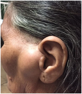 Lipoma is the most common benign tumour which occurs anywhere in the body where adipose tissue is present which is asymptomatic, slow growing and painless. The lipoma consists of mature adipose tissue and occurs commonly in region of back, shoulder and nape of neck. Adipose tissue also exists in the parotid gland, but lipoma of the parotid gland is rare entity. The incidence of this entity has been reported to be about 1% ranging from 0.6% to 4.4%.1 The exact aetiology of parotid lipoma is not known. The occurrence of parotid lipoma has been most commonly correlated to the trauma in this region but exact pathophysiological mechanism is not described.2 Lipoma is benign tumour arising from mesenchymal tissue mainly adipose tissue. Other mesenchymal tissue can combine with it to form angiolipoma, leiomylipoma, angiomyolipoma, fibrolipoma, neurolipoma, osteolipoma and chondrolipoma.3 Ultrasonography, computed tomography (CT), magnetic resonance imaging (MRI) and fine needle aspiration cytology (FNA) are of definite help in making preoperative diagnosis of parotid lipoma.4 Once a definite diagnosis of parotid lipoma is available, this can be kept under wait and watch until the patient demands its surgical removal because of cosmetic reason. The operation can be planned avoiding the injury to facial nerve and its branches.5 We report a case of sialolipoma in the left parotid of a 52year old female woman because of relative rarity who was treated with limited excision.