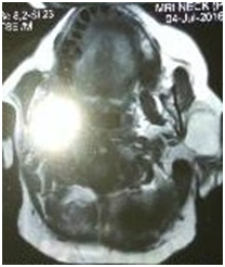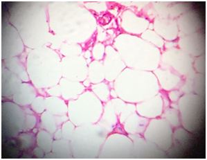 A 52years female presented with painless lump on the left side of face for last 9years. The onset of this swelling was insidious and there was no history of previous trauma. Clinical examination revealed a well defined swelling firm in consistency (Figure 1). At one place near the zygomatic arch the consistency felt to be hard. There was no cervical lymphadenopathy. The most probable clinical diagnosis was mixed parotid tumour or lipoma. Ultrasound examination revealed a hypoechoic, well circumscribed and lobular swelling in the superficial lobe of left parotid gland. Magnetic resonance scan revealed a low density mass in the left parotid gland (Figure 2) (Figure 3). FNA Fine needle aspiration cytology confirmed diagnosis of lipoma. A preauricular incision was made and parotid capsule was incised. The thinned out superficial lobe of parotid was separated giving exposure to lipoma. The branches of facial nerves were set aside. There was a well encapsulated bilobed lipoma in the parotid gland (Figure 4). The larger lobe was of size 9x6x3cm in the superficial lobe while in confluence the small lobe was 2x2cm size and present in the deep lobe. This bilobed yellowish mass was fully exposed and then enucleated. The raised superficial lobe of parotid gland was repositioned and wound closed over a mini negative suction drain. Postoperative recovery as well as follow up has been uneventful. The facial nerve functions were intact. There was no recurrence after nine months of follow up. Histopathology report of this specimen was consisting of mature adipose cells containing clear distended vacuolar cytoplasm and flattened small peripheral nuclei (Figure 5). The mass was well encapsulated lipoma.