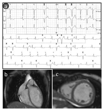 (A)ECG strip demonstrates the premature ventricular contractions (to 100PVCs/1h). (B &C) cardiac MRIetc-cardiac MRI features of cardiomegaly (b-long-axis and c-short-axis post contrast views ,there is no sub-epicardial or mild-myocardial pattern of late gadolinium enhancement).