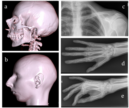 A, B) Cranium tomography (normal cranial suture, micrognatia) with 3-D scans reconstruction. There is no any evidence of MAD-specific bone dysplasia C) Normal clavicle (D&E) Absent of distal phalange acroosteolysis.