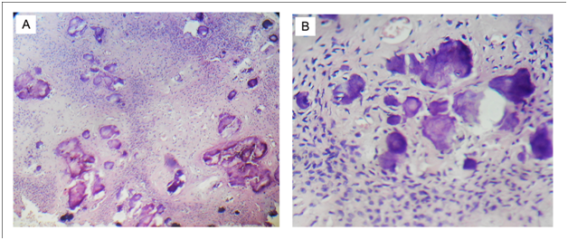 An 18year old female patient reported to the department of Oral Pathology, Dr. R Ahmed Dental College & Hospital, Kolkata with a complaint of swelling since 2years on the lower left jaw (Figure 1). The swelling was slow growing and painless. It was visible on the left side of the mandible and extended from left lower canine to left lower 2nd molar tooth (Figure 2). It was found as bony hard in consistency and non tender on palpation. Intra-oral examination revealed a dome shaped swelling measured approximately 4cmx3cm present on buccal vestibule of left mandible without any ulceration on overlying mucosa. The teeth involved were mobile and tender to pressure and percussion. Panoromic X ray revealed a distinct radio-lucency of approximately 5cmx3cm in size while scattered radio opacity was observed throughout the lesion (Figure 3). From this, the lesion could be provisionally diagnosed as fibro-osseous lesion/ameloblastoma. A biopsy was performed with local anesthesia and microscopic examination revealed fibro cellular stroma with multiple round oval hematoxyphilic calcified matrix similar to cementum/osteoid like material. There were no atypia or mitotic figures (Figure 4). These observations were consistent with cement ossifying fibroma. The management consisted of conservative surgical excision by curettage enucleation under local anesthesia raising mucoperiosteal flap. Post operative follow up was advised and after 6 month follow up the patient not reported any discomfort and panoromic X ray confirmed good bone regeneration in the operative zone.