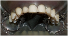 Static and dynamic occlusion was scrutinized. Minor adjustments were realized by means of fine diamond bur. Finally, the margins of the bonded veneers were finished and polished. The patient was satisfied with both esthetic and functional outcome (Figure 11) (Figure 12).
