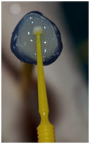 A 37% phosphoric acid etching gel was applied for 30seconds, as the preparation was within enamel (Figure 8), then rinsed off with water and dried until getting a frosty white appearance (Figure 9). Adhesive agent was applied and photopolymerized (Figure 10).