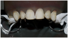 The rubber dam, key to success to bonding procedure, was carefully positioned between the first two premolars to achieve adequate isolation (Figure 6). Extreme care was taken during the bonding protocol. The following sequenced steps were meticulously considered: