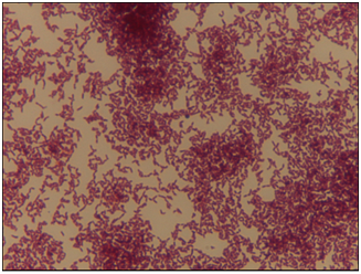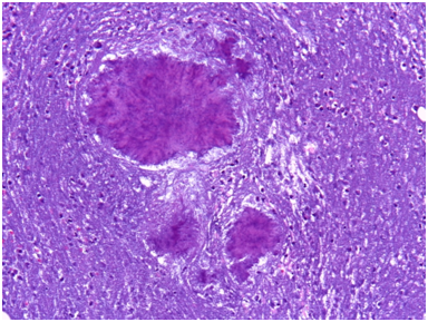 It was performed fine-needle aspiration puncture (FNA) in the subcutaneous nodule of the left knee and right elbow. It was obtained an hemato-purulent liquid without foul odor. A day later, oozing skin fistula appeared in his right knee. Histopathological examination of pus of knee and elbow subcutaneous nodules showed, abundant inflammatory infiltrate with eosinophil and polymorfonuclear neutrophils, and eosinophilic filamentous accumulation suggestive of Actinomyces (Figure 1). No neoplastic cells were obtained. Taking into consideration the results, treatment was switched to intravenous Penicillin G (5million units/6hours). Pus samples of subcutaneous nodules were incubated in anaerobic conditions in chocolate blood agar media. Cultures were positive at tenth day, filamentous Gram-positive fungal-like pathogens (Figure 2). Identifying species of Actinomyces meyeri was made by matrix-assisted laser desorption ionization time-of-flight (MALDI-TOF). It was sensitive to amoxicillin, penicillin, clindamycin, piperacillin-tazobactam and meropenem, and resistent to metronidazole.