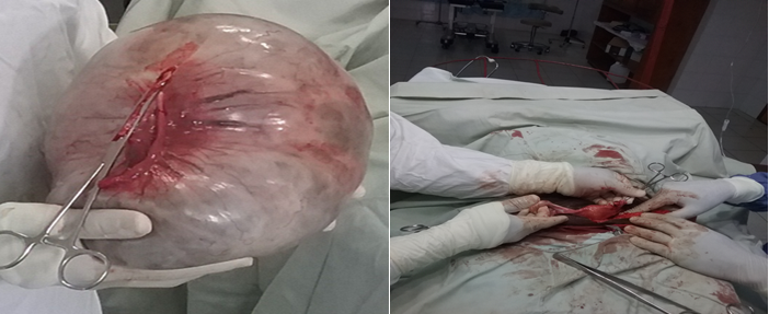 After obtaining a multidisciplinary consultation, a laparotomy under general anesthesia was decided. The patient was operated on with an informed consent. The patient was placed in supine position. The midline incision laparotomy from the xiphoid up to the suprapubic region was performed to allow wide exposure of the large mass. Intraoperatively, there was a large cystic mass. No adhesion was observed. Delicate extirpation of the mass after having removed all the ovarian parenchyma (Figure 2a & b). A left salpingo-oophorectomy and a wedge resection of the right ovary were performed without any hemodynamic and cardiac disturbance (Figure 3a & b), and the cystic mass was resected in total. It measured about 65 × 55 × 34 cm and weighed 24.73 kg (Figure 4a & b). The abdominal wall reconstruction was closed in layers (Figure 5).