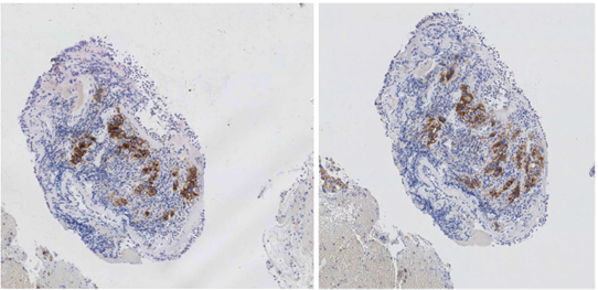 Patient died for cardiac tamponade from metastatic hemopericardium, after 36 months from the oncological diagnosis. It followed an autoptic investigation: the pancreatic histology was indicative for typical insulitis and pancreas beta-cells expressed PDL1 in 42% of specific endocrine tissue (Figure 1-2).