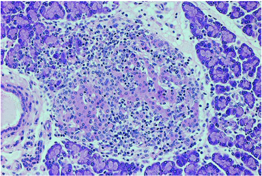 Figure 2 The pancreatic islets were infiltrated by numerous lymphocytes like a typical picture of immune-mediated insulitis.