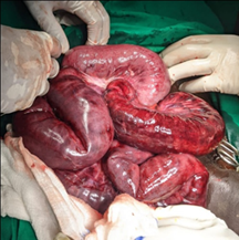 A 21-year-old black male patient who attended the general surgery service of the Sambwweni Hospital in the city of Ukunda, Kwale County, Kenya. He comes to our office with symptoms of distension and intense, diffuse, colic-like abdominal pain with the association of nausea and profuse vomiting, with a bilious appearance, where he reports not passing gas and feces through the rectum for 5 days. In addition, he takes a general fever of 38 degrees. In his general examination we found a patient with severe dehydration, peritoneal facies, accelerated radial pulse, hypotensive, with thermal gradient, oligoanuric, with slight seizure of the sensorium. It is decided to admit him, an emergency preoperative is performed where the hydromineral and acid-base disorders are confirmed, which are brought to stability values, complemented with antibiotic-parenteral therapy, decompressive measures and hydroelectrolyte resuscitation. On radiological examination we found a pattern of mechanical intestinal occlusion of the small intestine with central staircase fluid-air levels, with a rosary sign. The abdominal ultrasound confirmed the presence of distended loops without peristalsis accompanied by free fluid in the peritoneal cavity. He is taken to the operating room where the distention of the thin loops with suffering fluid is confirmed where we find a giant sigmoid volvulus with vascular compromise with the association of a partial volvulus of the small intestine (terminal ileum) that compromised the blood supply, forming part of the strangulating element of the sigma rotation. Initially, control and reception of the almost completely compromised sigmoid is carried out with subsequent anastomosis in a discontinuous plane with 3/0 polyglycolic acid suture. Subsequently, the reception and anastomosis of almost 15 cm of small intestine is evaluated and decided, where we perform an end-to-lateral ileoascendenteostomy in a discontinuous plane with 3/0 polyglycolic acid suture (reimplantation of the ileocecal valve). In addition, regulated peritoneal lavage is performed and two abdominal tubular drains are left with the modality of relaparotomy on demand. On the fifth day, the patient progressed favorably, complying with antibiotic therapy, total parenteral nutrition, maintenance hydration and supplementary measures. The patient was discharged after 10 days with a favorable evolution (Figure 1-3).