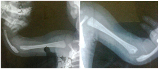 The occurrence of congenital absent radii without thumb aplasia and without evidence congenital thrombocytopenia or thrombocytopenia occurring early life is extremely rare and has not been reported in Iraq.9,10 Review of the literature revealed that the first well document of case of congenital absence of the radii without thumb aplasia was reported by Edward Reginald Secord from Canada in 1915.11 Thereafter, and during more than one century less than 20 cases have been reported in the literature.12–14 The patient of Secord was the fifth child of apparently healthy parents. The second child of the parents had a very similar deformity of both arms, and died of inanition at the age of seven weeks. X-rays showed total absence of both radii, without any other congenital deformity. The metacarpal bones are perfect in number and development.11 Goldenberg reported possibly identical male twins with bilateral complete absence of the radius occurred in association with spina bifida.12