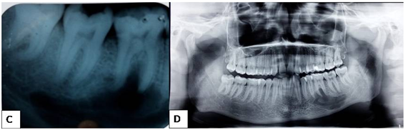 A 21 year old medically fit male patient visited our dental department with a chief complaint of a decayed tooth in relation to the lower left back tooth region since 6 months. Patient gave a history of pain in relation to the same on biting on hard food which relieved at rest. Pain was intermittent, pricking type, non radiating in nature. Patient gave a history of being hospitalized a year back following a sports injury where he hit his left side of the face on the ground, for which symptomatic treatment was given. His family history was non contributary. There was no abnormality detected on extraoral examination. On intraoral examination, there was a grossly decayed tooth in relation to the lower left back tooth region involving enamel and dentin and appeared brownish black in colour. No other soft tissue abnormalities were detected or any vestibular space obliteration in relation to the same region. Based on and clinical presentation, a provisional diagnosis of deep dentinal caries in relation to lower left back tooth region was given. Intra oral periapical radiographic (IOPA) examination revealed loss of crown structure and radiolucency involving enamel, dentin and approximating pulp with periapical widening of periodontal ligament space in relation to lower left back tooth region. A well defined radiolucency with a well defined sclerotic border was seen in relation to the root apices of lower left back tooth region extending from 35 to 37 region which scalloped in between the roots superiorly and extended till the inferior border of mandible inferiorly. An Orthopantamograph (OPG) was taken to confirm the extent of the lesion and it revealed the same. On noticing the incidental radiographic finding, an Electric pulp vitality test was done to confirm the vitality of the teeth involved in the region. It was found that there was normal pulpal response in relation to 36 and delayed response in relation to 35 and 37 showing that these teeth were vital.