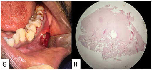 Even in the cases where the lesion is associated with roots of teeth, there is no increased mobility of the teeth or changes in their color. The present case too had normal appearing teeth associated with the lesion. Pulp vitality is not likely to be altered. However, due to traumatic force, cystic expansion may increase the root pressure resulting in a temporary reduction in the pulpal response to the electric test which holds good in our case too.9-15 Clinically, there are no soft tissue changes, pain or paresthesia. In the early phases, there is usually no bone expansion while in the later phase; there can be bone expansion. In our case there was no bone expansion.12 Periapical radiographs are ideal for early radiographic assessment but these radiographs fail to show the whole extent of the lesion. Panoramic radiography, computed tomography and magnetic resonance are more precise imaging modalities in the diagnosis of these cysts. In our case the cyst was an incidental finding in an IOPA the extent of which was found later by an OPG.8 Radiographically, these lesions appear as a well defined radiolucent defect with diameter in the range of range 1 to 10 cm as seen in our case.10 The cysts usually presents as scalloping pattern between the roots of the involved teeth which was seen in our case too where the cyst scalloped between the roots of 36 and 37.11 The structure of the mandible canal may in some cases be preserved and in other cases not. There is no resorption of the teeth roots. The lamina dura may or may not be involved.4 In our case, the lesion involved the mandibular canal, with loss of lamina dura but no root resorption. Histopathological examination reveals a thin band of vascular fibrous connective tissue lacking an epithelial lining. In our case also histopathological examination revealed bone tissue and extravasated RBCs without lining epithelium.13 Treatment is surgical operation which consists of evacuation of the content, cochleation of the cavity in order to stimulate bleeding in the cavity. The wound is then sutured. This is followed by the formation/creation and organisation of a clot, and healing by the formation of new bone.14 In our case also treatment consisted of bone curettage under local anesthesia and surgical closure of the wound. The patient will be monitored clinically and radiographically every 6 months to follow the progression of healing. Healing occurs about 6 to 24 months after bleeding and closure of the area. Prognosis is usually excellent with rare chance of recurrence15 (Figure 1-4)
