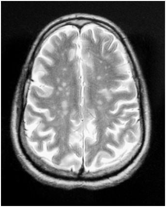 Figure 1 Axial T1-weighted brain MRI with injection: multiple hyper signals of deep periventricular white matter enhancing after Gadolinium.
